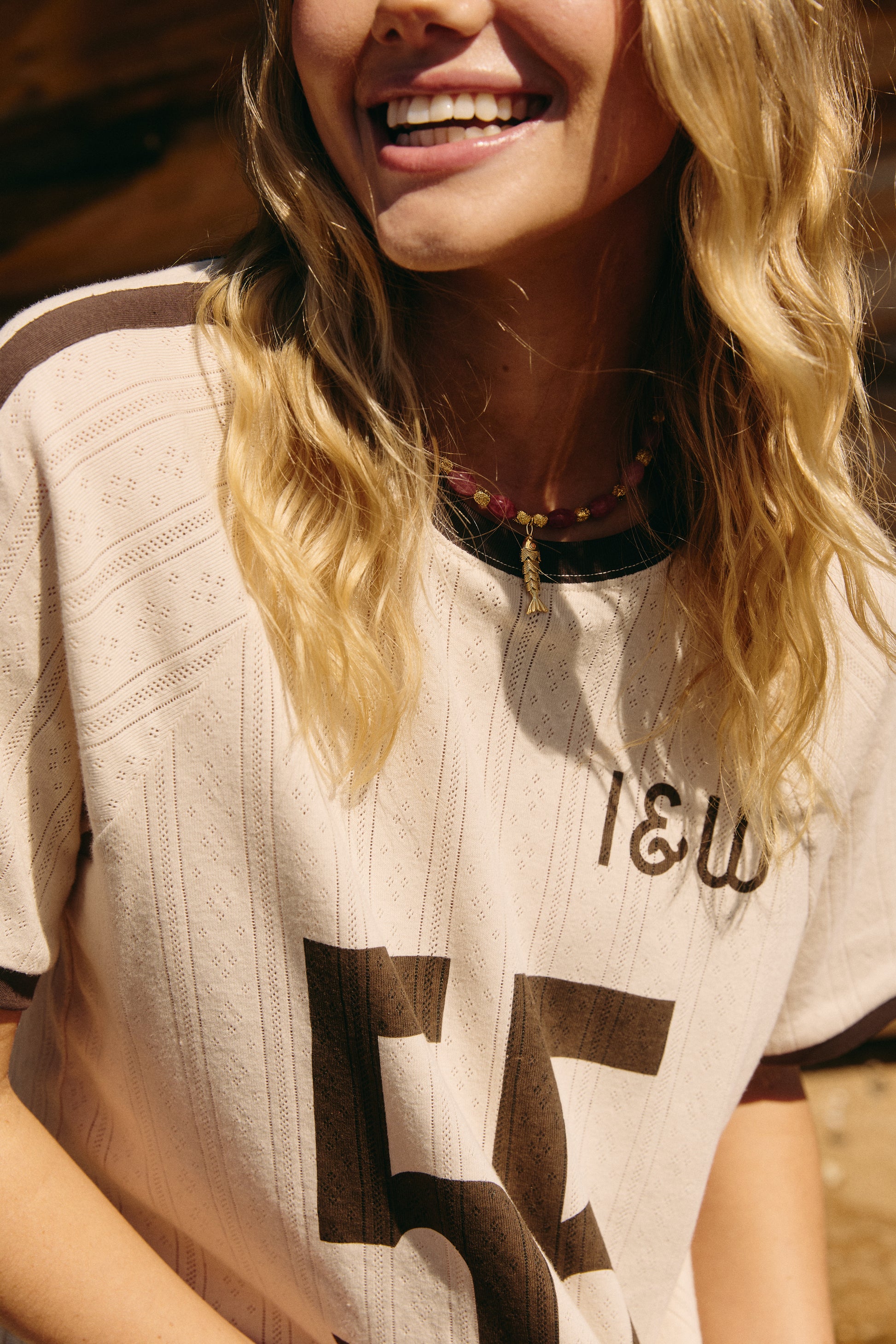 The Club 55 Tee is crafted from organic cotton pointelle — a lightweight, breathable fabric.